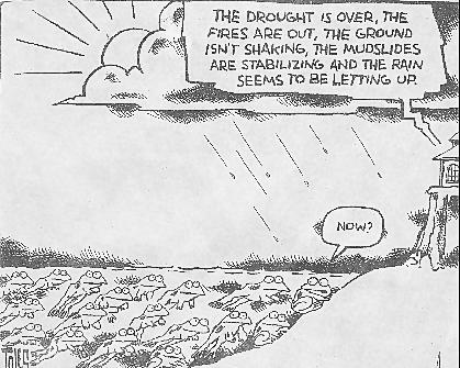 If Noah still lived today: In the year 2005, the Lord came unto Noah, who was now living in the United States, and said, "Once again, the earth has become wicked and over-populated and I see the end of all flesh before me. Build another Ark and save two of every living thing along with a few good humans." He gave Noah the blueprints, saying, "You have six months to build the Ark before I will start the unending rain for 40 days and 40 nights". Six months later, the Lord looked down and saw Noah weeping in his yard .... but no ark. "Noah", He roared, "I'm about to start the rain! Where is the Ark?" "Forgive me, Lord," begged Noah. "But things have changed. I needed a building permit. I've been arguing with the inspector about the need for a sprinkler system. My neighbors claim that I've violated the neighborhood zoning laws by building the Ark in my yard and exceeding the height limitations. We had to go to the Development Appeal Board for a decision. Then the Department of Transportation demanded a bond be posted for the future costs of moving power lines and other overhead obstructions, to clear the passage for the Ark's move to the sea. I argued that the sea would be coming to us, but they would hear nothing of it. Getting the wood was another problem. There's a ban on cutting local trees in order to save the spotted owl. I tried to convince the environmentalists that I needed the wood to save the owls. But no go! When I started gathering the animals, I got sued by an animal rights group. They insisted that I was confining wild animals against their will. As well, they argued the accommodation was too restrictive and it was cruel and inhumane to put so many animals in a confined space. Then the EPA ruled that I couldn't build the Ark until they'd conducted an environmental impact study on your proposed flood. I'm still trying to resolve a complaint with the Human Rights Commission on how many minorities I'm supposed to hire for my building crew. Also, the trades unions say I can't use my sons. They insist I have to hire only Union workers with Ark building experience. To make matters worse, the IRS seized all my assets, claiming I'm trying to leave the country illegally with endangered species. So, forgive me, Lord, but it would take at least ten years for me to finish this Ark." Suddenly the skies cleared, the sun began to shine, and a rainbow stretched across the sky. Noah looked up in wonder and asked, "You mean, You're not going to destroy the world?". "No," said the Lord. "The government beat me to it."